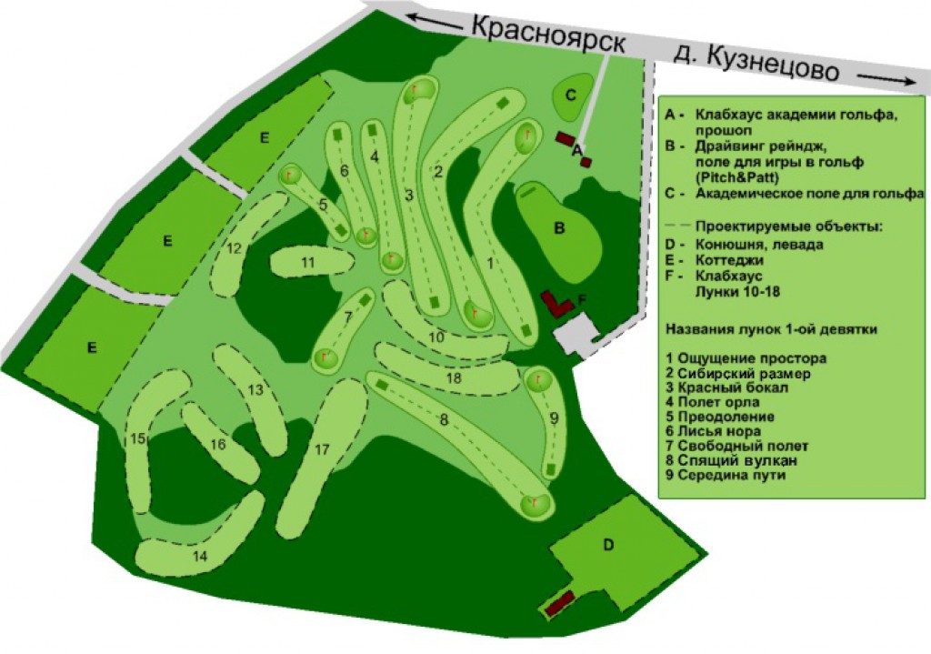 - Размер площадки – 980 м. для формата питч энд пат, forest hills протяженность 3,5 км. (9 лунок), школа гольфа, магазин инвентаря